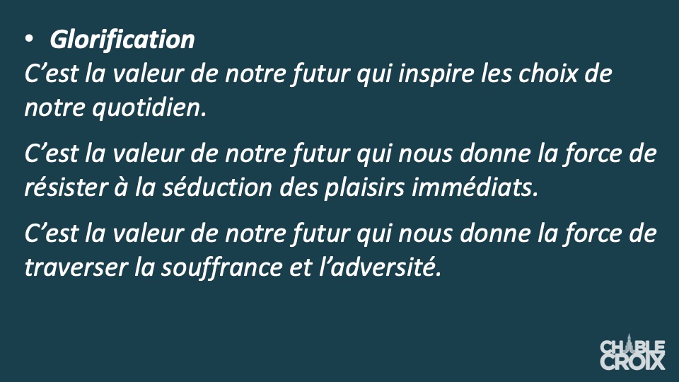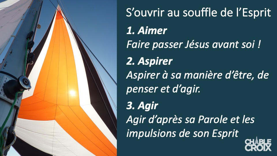 Réfléchissez à comment intégrer les "3A" de la vie de l'Esprit : Aimer, Aspirer et Agir dans votre vie quotidienne.